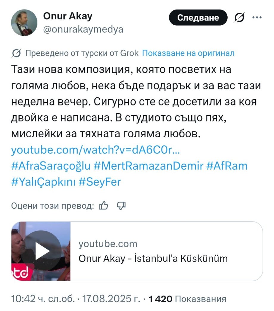 Онур Акай е готов с новата си песен и ще я пуска. Същата е вдъхновена от голямата любов на Афра и Мерт. Посвещава я на Афрам Simple Smile