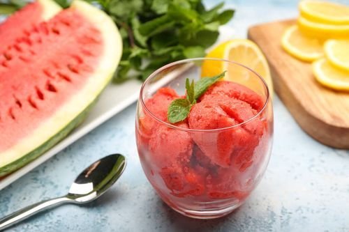 Отстранете семките от динята и я нарежете на малки парченца. Отрежете и 2 тънки резена лимон. Сложете ги в купа или найлонов плик и замразете за 2 – 3 часа. След това ги извадете от фризера и ги пасирайте в блендер на висока скорост за няколко минути, докато сместа стане гладка. Изстискайте сока от останалия лимон, добавете го към динената смес и разбъркайте. По желание може отново да разбиете в блендера. Разпределете сместа в купички, поръсете по желание с кокосови стърготини и сервирайте.