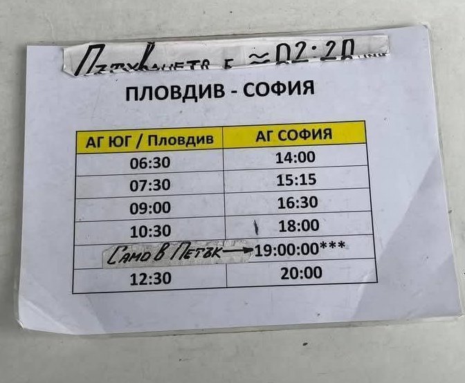 Някой в предишна тема беше пуснал снимки от разписанието от София към Пловдив (естествено, пак не успявам да открия къде са). Възможно ли е наистина да няма автобус към Пловдив в 19 ч или 19,30 ч?🙁