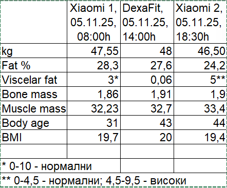 Благодаря, Navy. Аз имам 2 Xiaomi - единия е от 2021, другия от тази година. Някакъв ориентир са, но и двата работят с различни приложение и показват различно.  Преди 2 седмици правих DexaFit - body composition и изследване за костна плътност отделно. Та там пък резултата е между показанията на двата ми кантара. Като цяло по всички показатели съм по-добре от хора в моята група, но пък индувидуално погледнато мускулната ми маса е под минимума и е желателно да я увелича.