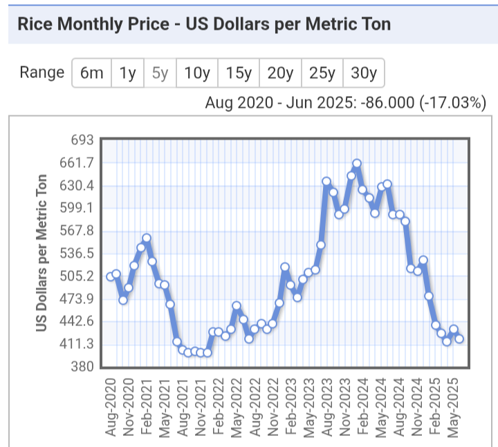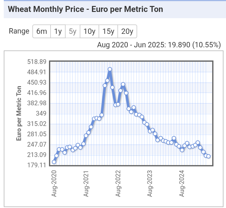А от земята напоследък се изкарва по-малко. Ето цената на пшеницата - беше се качила покрай войната в Украйна, после пак си падна и си е колкото беше преди 5 години: