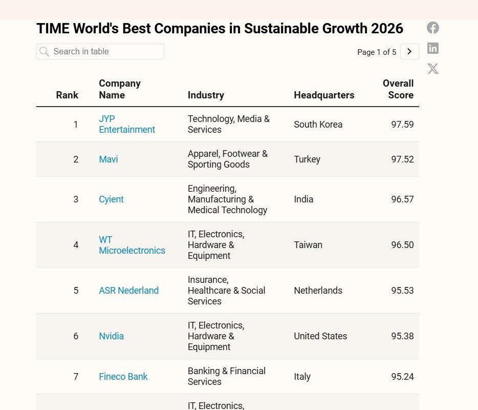 Класацията включва само компании, които открито разкриват своите данни за околната среда. Според съобщение на официалния уебсайт на TIME, южнокорейската компания JYP Entertainment зае първото място тази година с резултат 97,59. Турската компания Mavi се класира на второ място с резултат 97,52, а индийската компания Cyient се класира на трето място с резултат 96,57. Съобщено от: patronlar.dunyasi