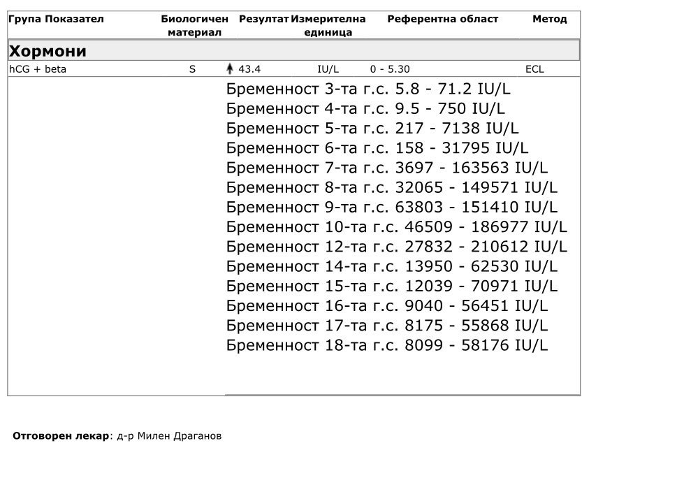Това ми бяха резултатите на 6ти ден от трансфера на два петдневни ембриона + положителен уринарен с бледа черта.. зарадвах се и след това се сетих, че ми биха хореомон ( не помня колко единици) и че този резултат се дължи на него. Но днес е 8 ден след трансфера и сутринта реших да направя пак уринарен, отново беше положителен със същата бледа черта, но се показа след около 10 мин. Иначе преди това не се виждаше нищичко. Понеделник ще направя пак кръвен, дали има възможност за бременност според вас. На 6 и 7 ден имах леко кафеникаво зацапване.