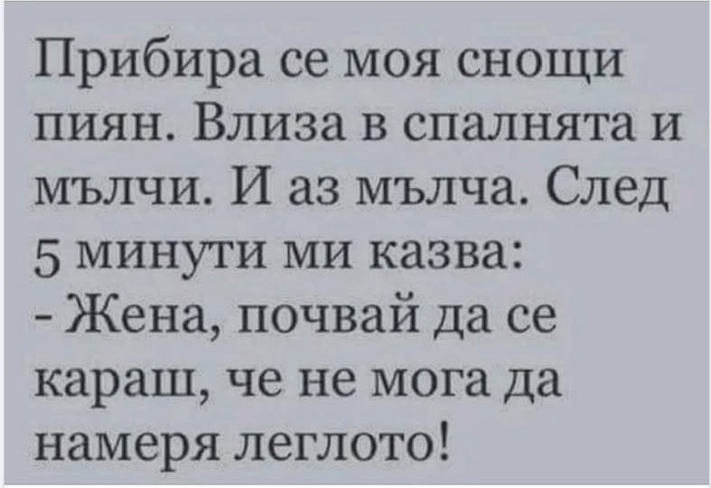 -Шефе, алармата звънна, събудих се, тръгнах да прескачам моя и като се закачих...