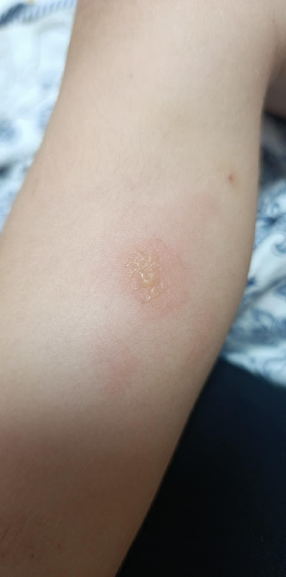 От снимките точно така изглеждащо ухапване получавам и аз като ме ухапе едно насекомо, което мисля, че се казва пясъчна муха. Накъде го наричат и папатак. Прилича на нещо средно между комар и молец. Мъничко е, но с кафяви крила, не прозрачни като комар. Като ме ухапе получавам такъв, може и по - голям мехур и даже около мястото става червено и се втвърдява от подуто, но и много сърби. Вие казвате, че при вашия случай няма сърбеж. Сърбежът от пясъчна муха е силен, дори и аз като възрастен се изкушавам да се почесвам и започва да изтича от течността в мехура. И аз ползвам фенистил и едно друго кремче за сърбеж след ухапване, купувано от лили. Агива протект се казва. Много е неприятно и след това даже ми остава белег. Кожата на мястото на ухапването си остава по - тъмна  и месеци след като вече е оздравяло