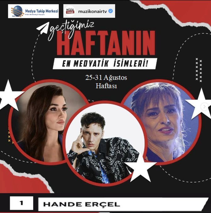 Ханде Ерчел се класира на първо място в списъка с най-медийно повлияните имена за седмицата от 25 до 31 август, обявен от muzikonair и определен от Центъра за медиен мониторинг.