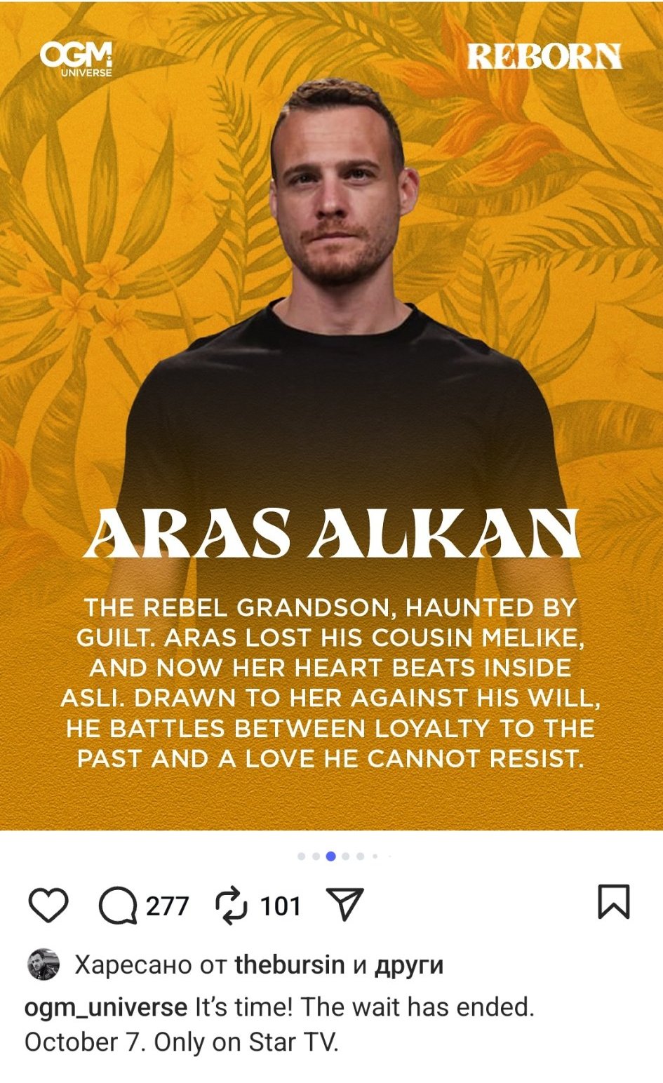 Преди 5 дни има публикация в инстаграм профила на ogm_universe (фирмата, която се занимава с международното разпространение на сериалите на OGM pictures). В публикацията Арас е представен така:
