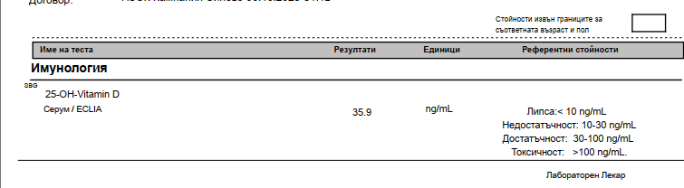 Елора ТСХ го остави, проблема е, че Т3 ти е поднормен чак, конверсията е доста зле. До сега на колко си била и от колко време не си се изследвала? Иначе Д трябва да се вдигне още, не е добре с такава стойност, при граница 100 е добре да е около 70. Феритинът е нисък, не знам при другите граници колко ти е бил, но тук трябва около 60-70 да е добре, или поне моят беше толкова и ми казаха, че за жена е добре.