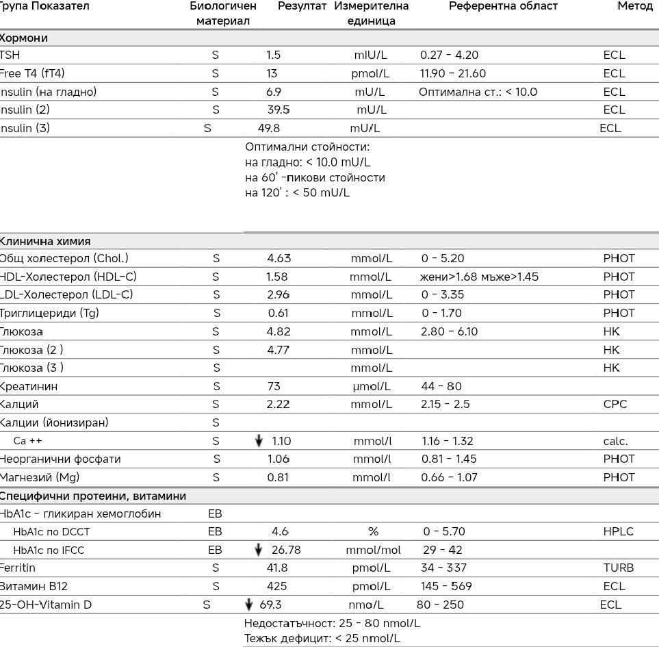 Insulin (на гладно)   S        5.69       mU/L     Оптимална ст.: < 10.0     ECL