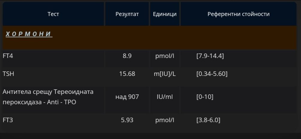 Та, всички тези години, кардиолог изписва лекарства за кръвно и бетаблокери за да лекува симптоми, ендокринолог- лекарства за регулиране на кръвната захар и статини, никой не се замисли дали пък да не се изследват щитовидни хормони...пуснах си ги сама.