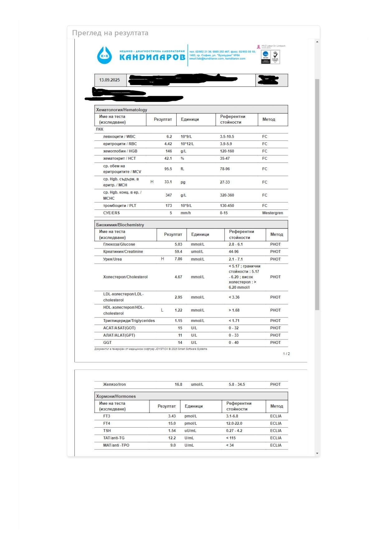 Здравейте ето ги и моите резултати от август.Родих декемрви месец, през бременноста не съм пускала изследвания за щитовидната.Преди това имах Хашимото но беше в нормални граници.Сега пия еутирокс 50 мг през ден 100 мг но се чувтсвам напрегната психически и усещам тремор като стоя на стола,виене на свят също и светлината ми дразни.Има ли някой с подобни резултати и симптоми какво мислите.