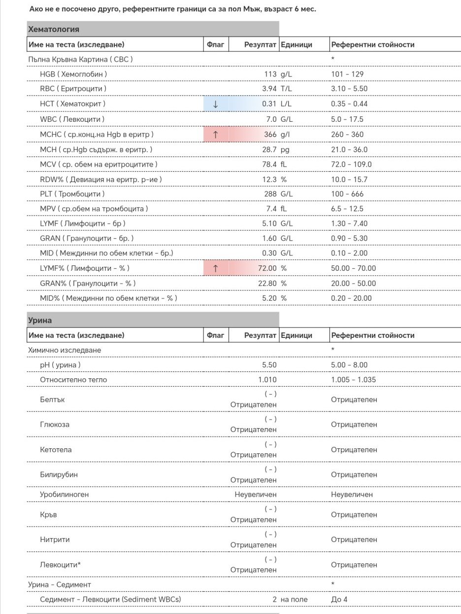Голямо приключение беше със събирането на урина 😃 отне ни около два часа.....пи 200мл. мляко, пи вода, масажирахне със студена мокра кърпа, пускахме звуци на потоци и рекички, отидохме на отворена врата, после пък му правихме топло на краченцата. Вече се бяхме отчаяли, нооооо случи се 😍 Чак в 11:40ч. му взеха кръв в лабораторията, но казаха, че не е проблем. Прикачвам и резултатите, има ли други бебчета с такива отклонения. Мисля, че са напълно нормални и в петък сме при педиатърката за мерене и ваксина, тогава ще ги покажем. 🤗