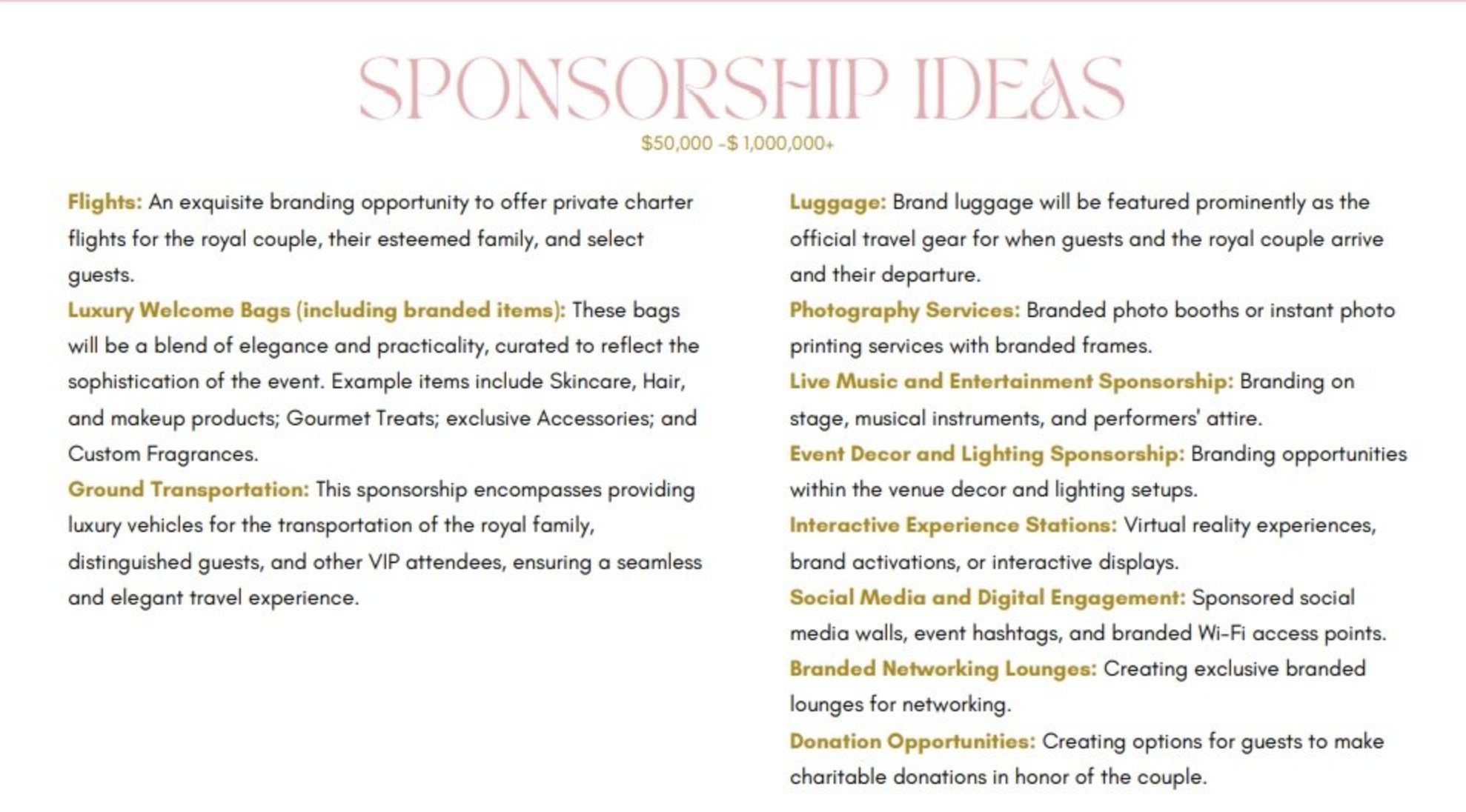 В презентацията се обещават също и massive global exposure, enhanced brand prestige чрез асоциации на марката с кралска сватба.