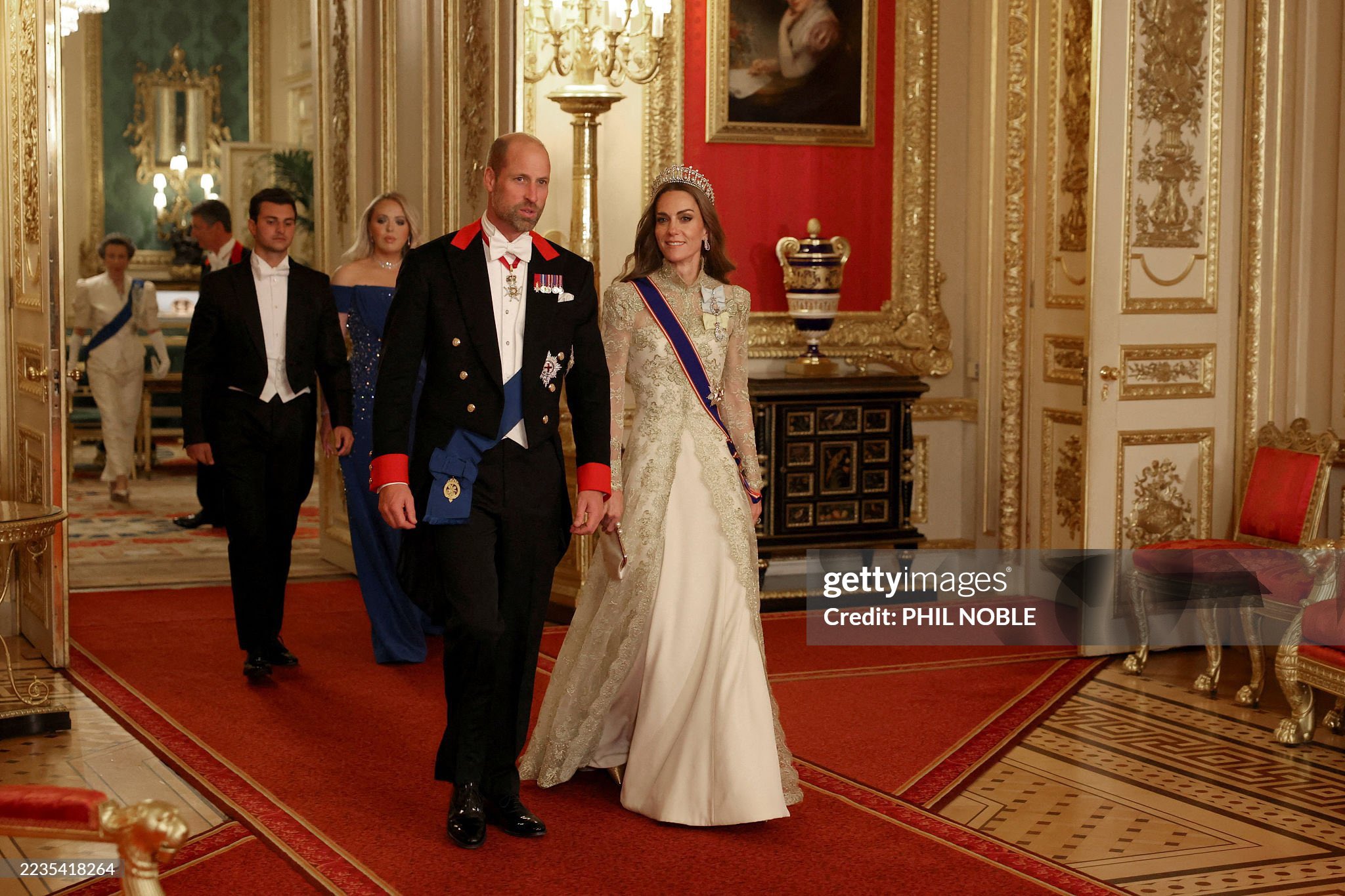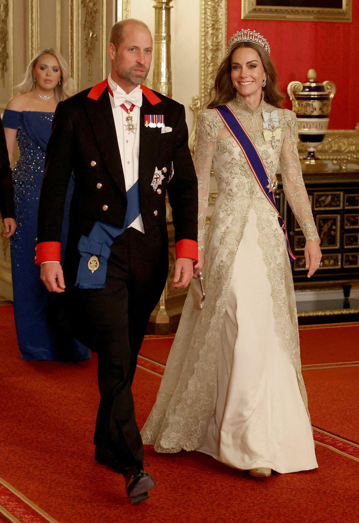Принцесата на Уелс е облечена в рокля от британския дизайнер Филипа Лепли, както и в дълго, ръчно бродирано вечерно палто от златна дантела Шантили върху копринена креп рокля.