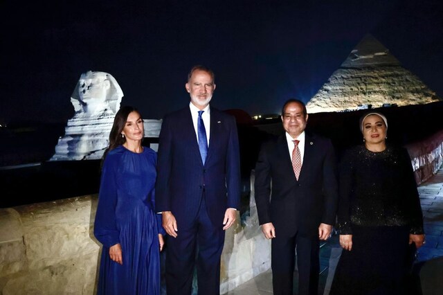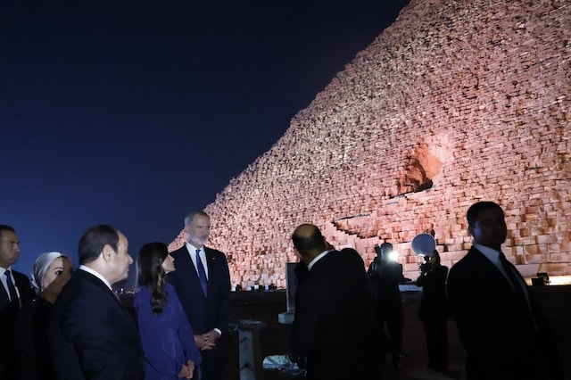 Снощи извън официалната програма, испанците и президентската двойка на Египет са направили обиколка с екскурзовод на Хеопсовата пирамида и Сфинкса, където са имали възможност да видят от първа ръка осветлението с испански привкус. Осветлението, охраната, термокамерите и аварийните батерии са проект на Isdefe (Ingeniería de Sistemas para la Defensa de España SA) с различни испански компании като Grupo Tragsa и Revenga. Проектът е осъществен със средства от FIEM (Фонд за интернационализация на бизнеса), а бюджетът му за Гиза и други емблематични забележителности в Египет е 10,5 милиона евро. След това са вечеряли в ресторант Mena House в хотел  Marriott, откъдето могат да се наблюдават пирамидите в Гиза.