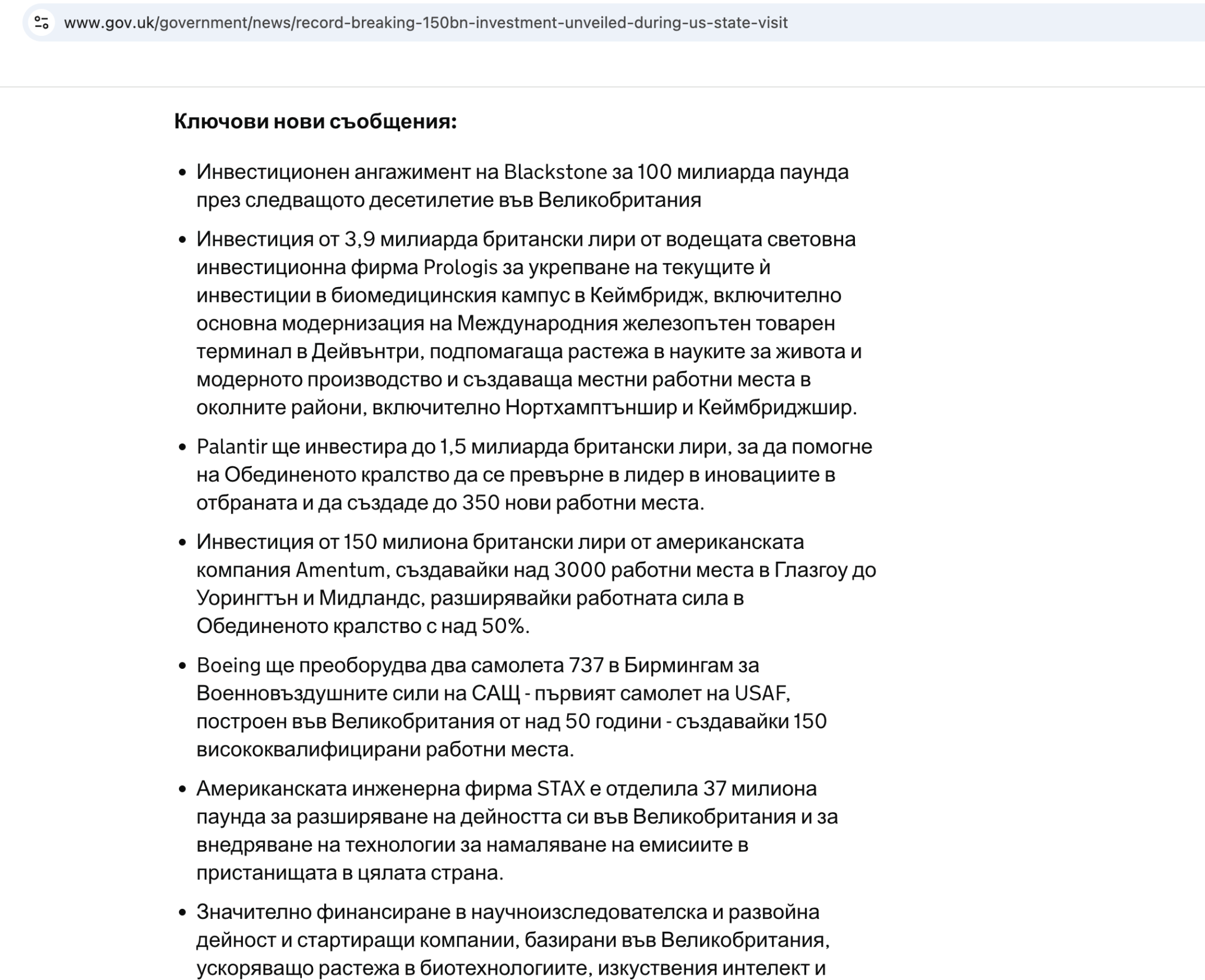 къде са тези анализи?  Всички световни медии пишат обратното, договорени са 150 милиарда долара технологични инвестиции във Великобритания. Лидерите на американските технологични компании дойдоха на крака за приема - Apple, Open AI, всички.
