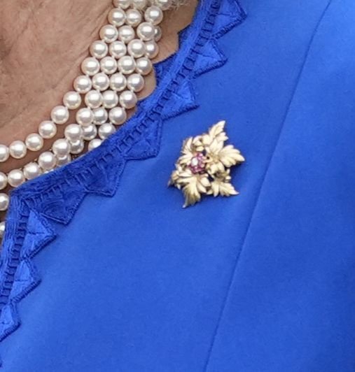 За кралица Камила американците избраха винтидж творение на Tiffany & Co. под формата на брошка от 18-каратово злато, диаманти и рубин.В доказателство за своята признателност и уважение към семейство Тръмп, Нейно Величество носеше дрехата само часове по-късно на военната церемония „Beating Retreat“ в замъка Уиндзор.