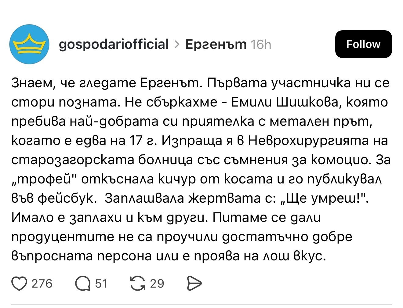 А на мен ми заприлича на Елен Колева без грим, аз не знаех, че е почнал Ергенът и се чудех в каква връзка пак се появява в интернет пространството, че тя зачезва и се активизира, после разбрах, че това е друга девойка кандидат ергенка.