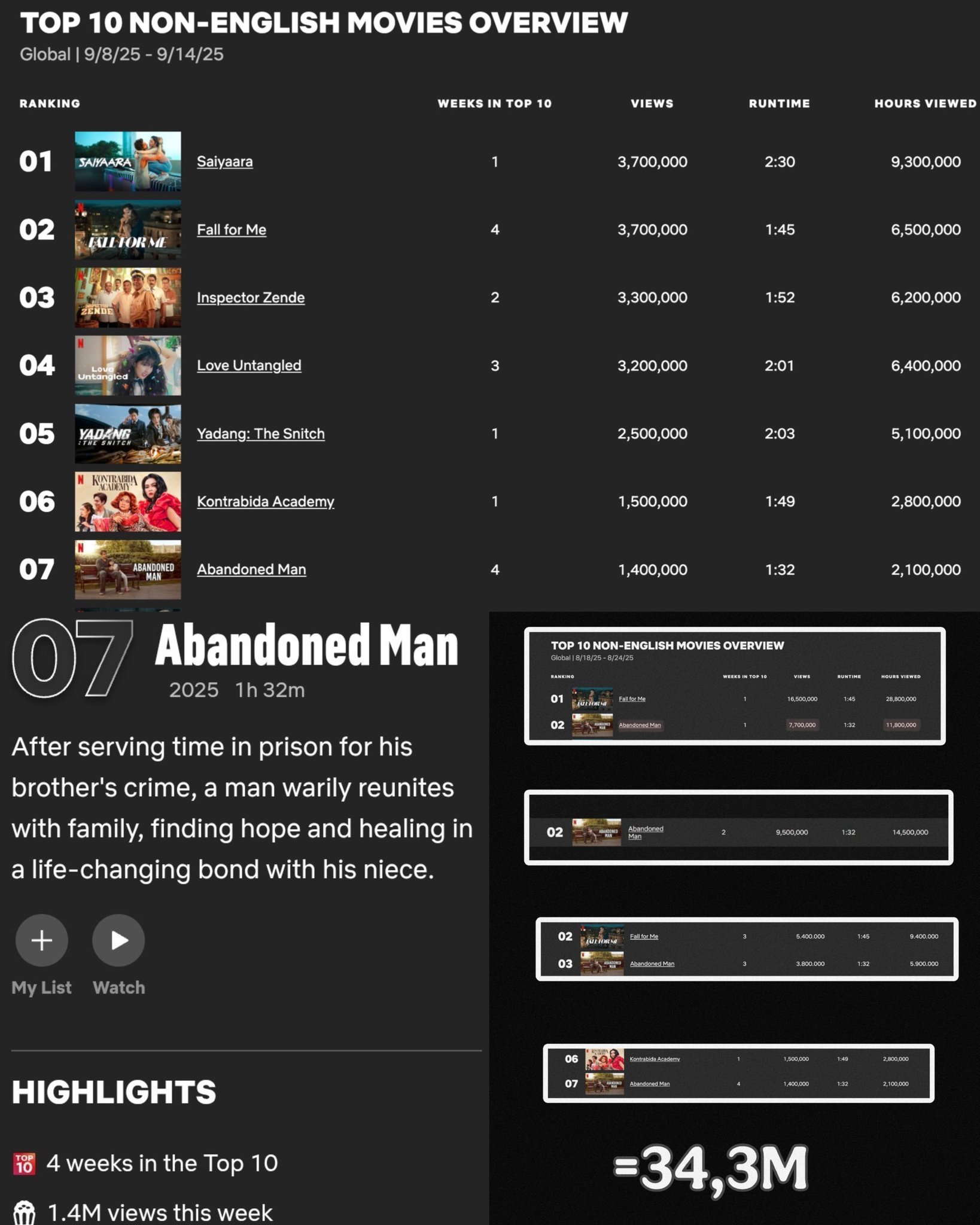 Миналата седмица той се класира на 7-мо място в категорията „Филми на неанглоезичен език“ на Netflix с 2,1 милиона гледани часа и 1,4 милиона гледания. КЛАСИРАН В ТОП 10 В 5 ДЪРЖАВИ