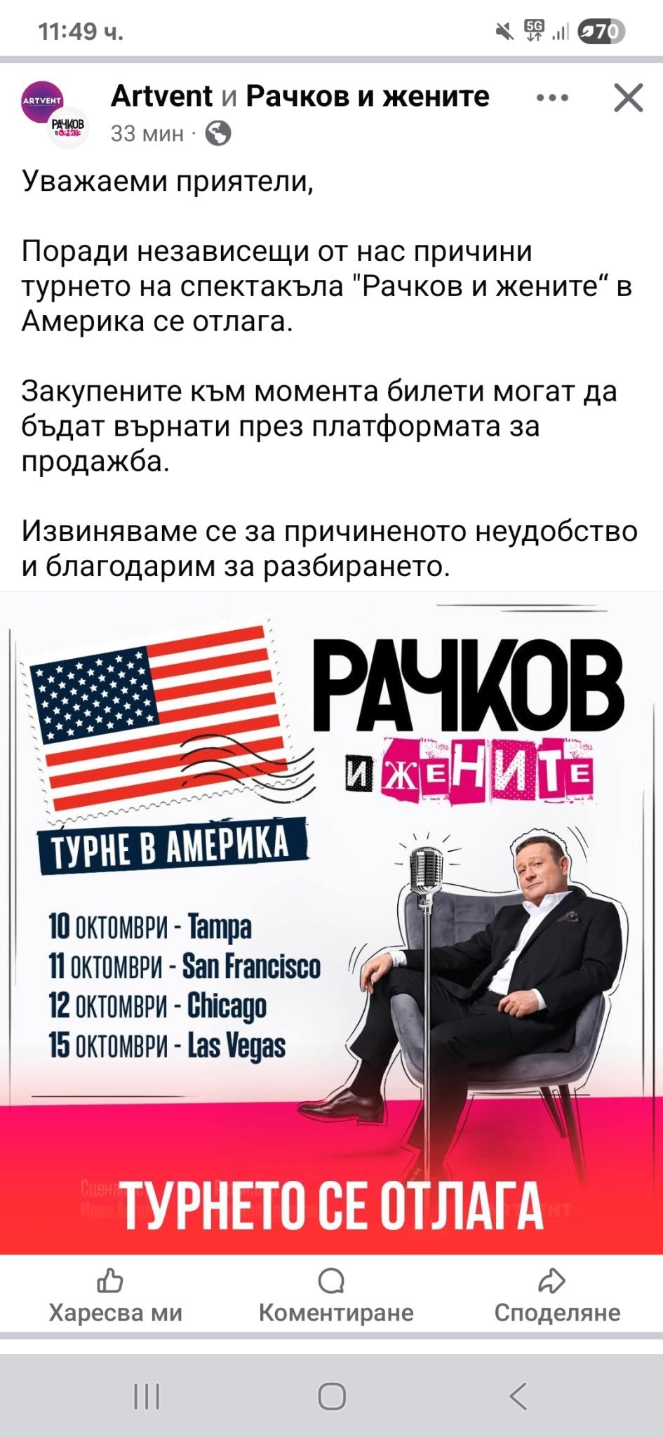 Вярно е . В моят град щеше да се състои " Съвършени натраници " , но поради неизяснени причини няма да се състои.  Добре че ни закупих билети предварително . За хората обаче в чужбина е още по тъпо . Ще е глупаво ако причината е че Рачков не е събрал достатъчно публика , неуважително е спрямо хората който са си закупили билети и го чакат .