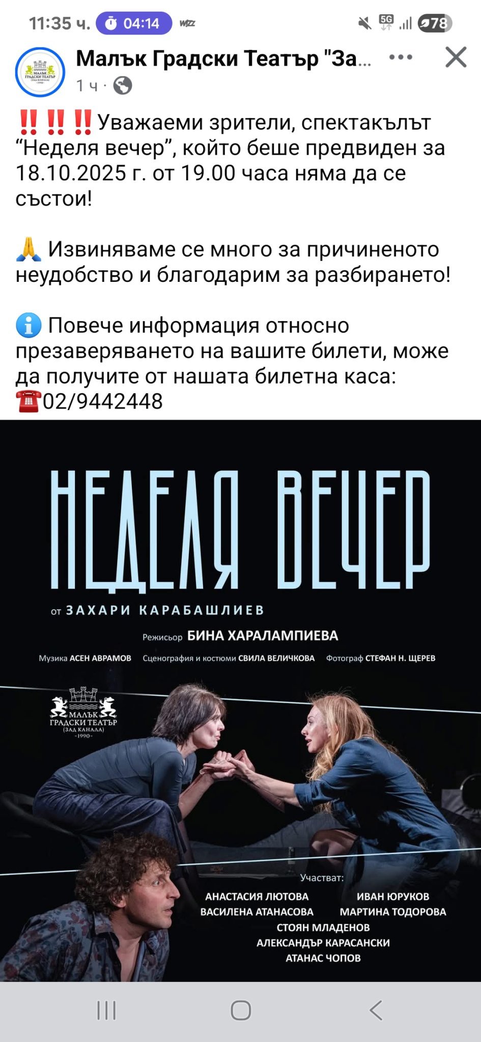 Аз даже си помислих че отново за Artvent . 😅😅 Жалко , напоследък много започнаха да се отменят постановки , много модерно май стана напоследък . Чак е дразнещо .