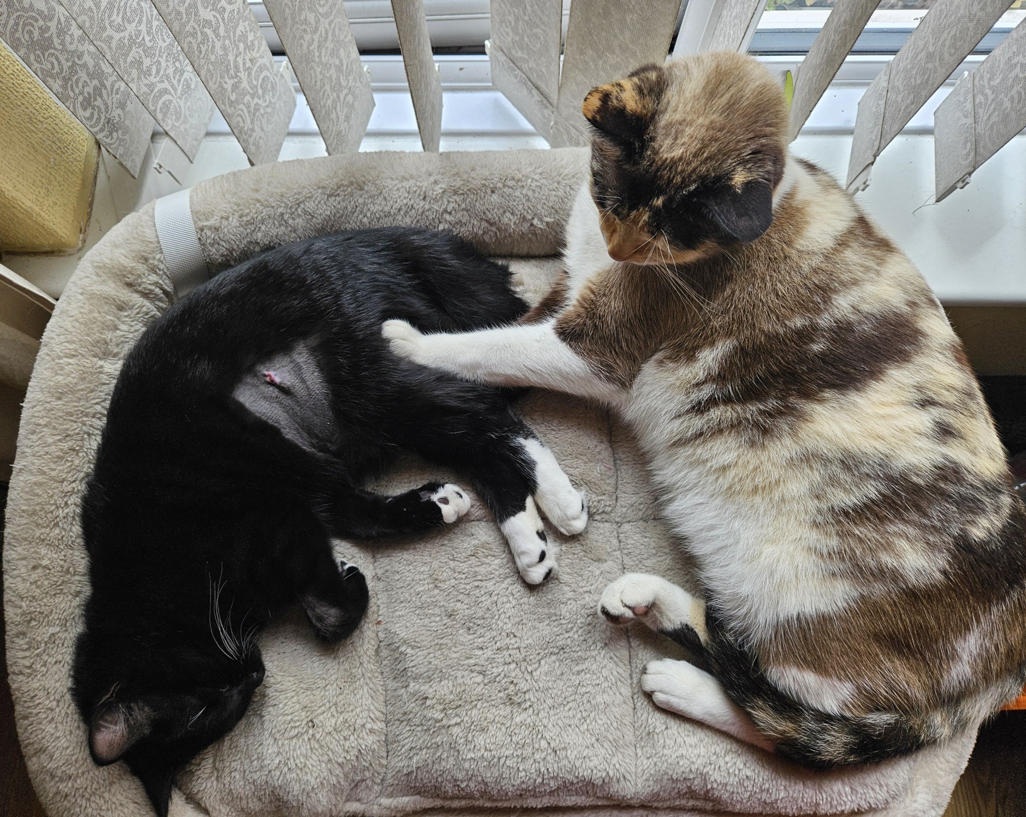 Момичето днес. Вчера беше много нещастна, със спуснат трети клепач и основно спа и лежа. Днес след добър сън вече е енергична и напълно готова за щуротии, търчи, скача и се мятка, така че се налага физически да я пазим и да разделям котките, защото се хвърля на борба, а не искам Минка да я нарани случайно, ако засегне раната. Цура я съска повече от обичайното, вероятно още много мирише на ветеринарите. Минка също я ръмжа и съска, но после я остави на мира, облиза я и сега спят заедно, както преди. Раната изглежда добре, утре е на контролен преглед.