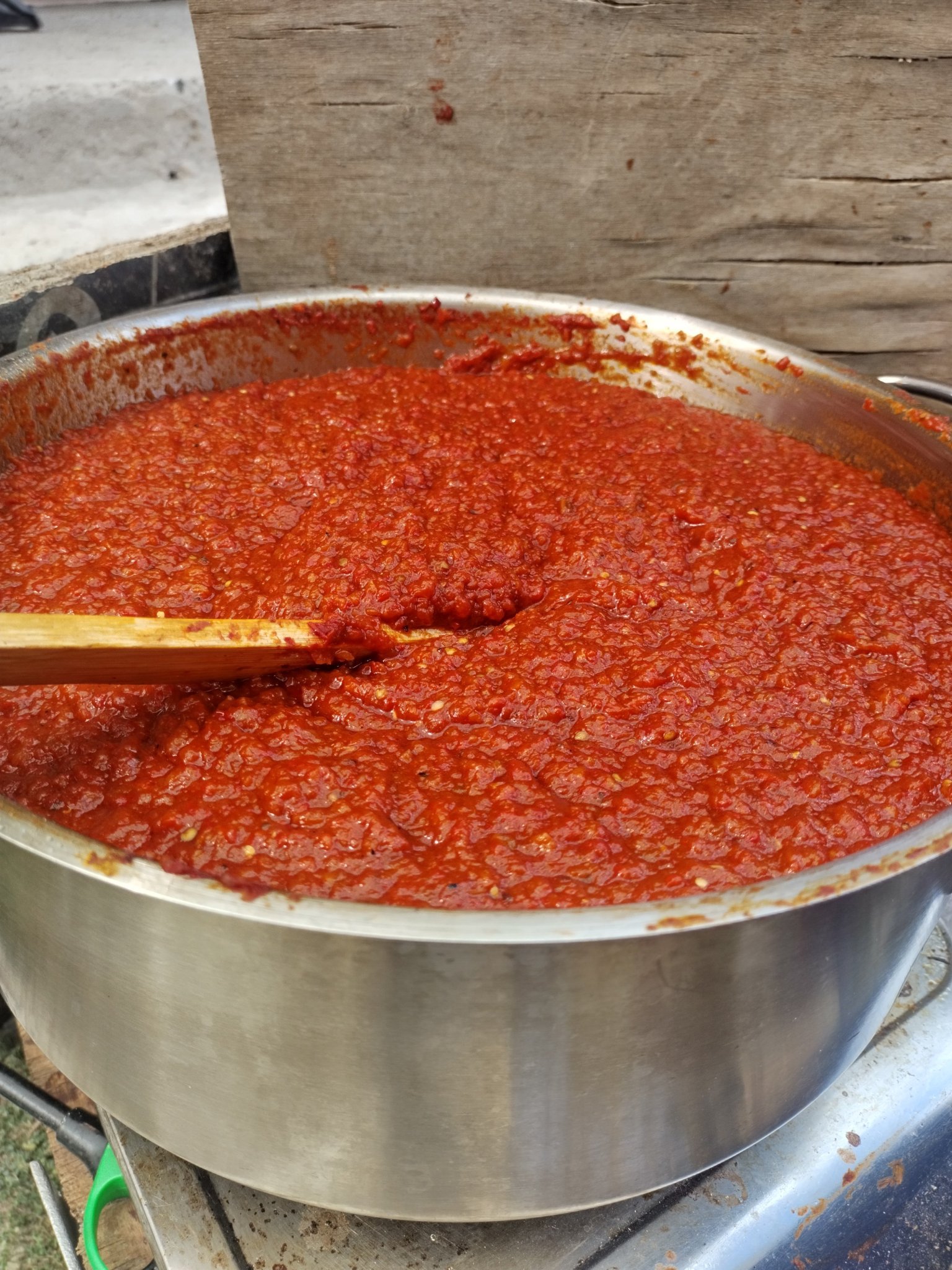 А при другата слагам от 20кг продукти нагоре. И това на открит огън с дърва, някой стои до огъня, следи го, бърка да не загори, поти се. Този процес ни е тежък. И става дълго, е, и бурканчетата са различен брой после. Та така ги аз разделям. При нас днес беше много топло времето, половинката мрънкаше до огъня, но изпълняваше нарежданията.