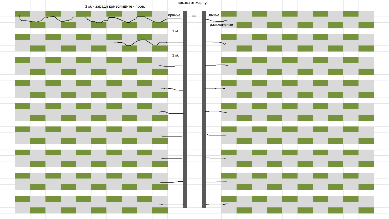 В картинката по-долу е схемата, зелените квадратчета са растенията, сивите участъци са един ред. Ще се захранва от чешмата директно на първо време, като до входната точка възнамерявам да се стига от обикновен маркуч, ако е възможно. Няма да се полива автоматично на първо време, а само когато съм там. Всяко разклонение на редовете ще има отделно спирателно кранче. Питам се дали е възможно централната тръба (маркуч) да е една, вместо 2, т.е., ще може ли да се поливат едновременно напр. 15 реда по 3 метра директно от чешмата. Налягането във водопровода не е от най-силните, но не е и мн. слабо. Ако не става от чешмата може да минава първо през бидон и да сложа помпа, но засега не намирам място за кубитейнери. Ще слагам капковото, защото сега ми отива половината уикенд в поливане.
