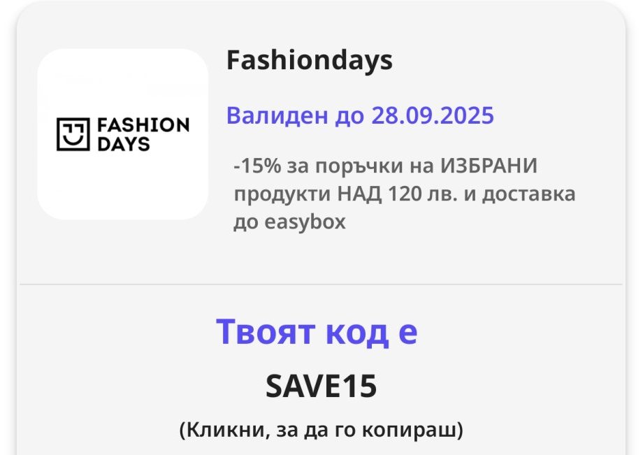 За Fashion days Код, но не общия SAVE15 не ми го хваща. Ако някой има друг, ще съм благодарна!