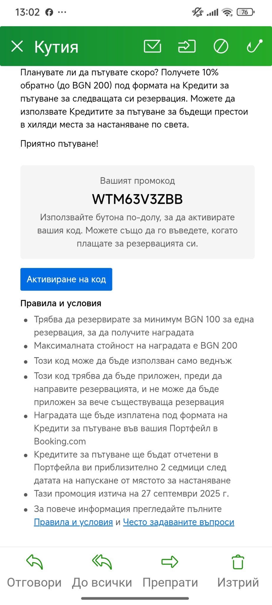 Сега пък аз получих код за booking - различен е от този на сестра ми, който дадох по-рано днес. Важи до 26/09/2025г.