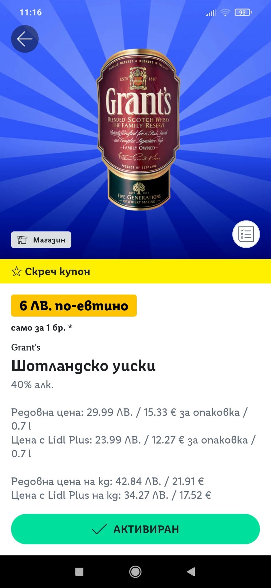 Предлагам скреч карта за уиски от Лидл, минус 6 лв. от цената, моля пишете на лично.