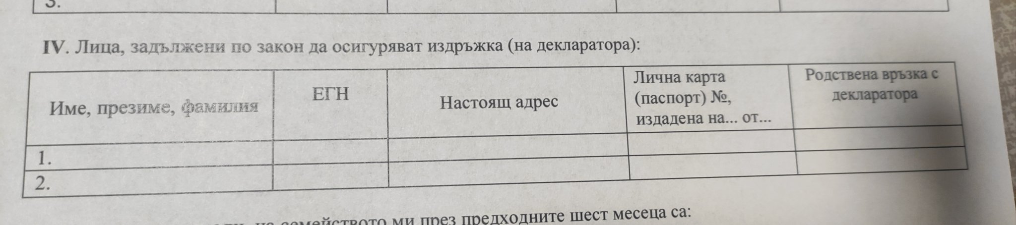Така е издръжката не се декларира, декларират се само "Лица задължени по закон да осигуряват издръжка на декларатора", цитирам конкретно IV точка от декларацията, за отопление.
