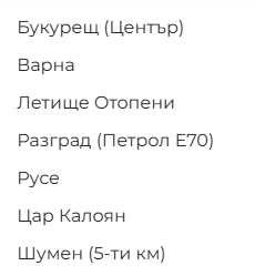 Превозът е с бус с места за 18-20 пътници. Има възможност за качване от следните точки в Североизточна България, а в Букурещ спира в центъра и на летището: