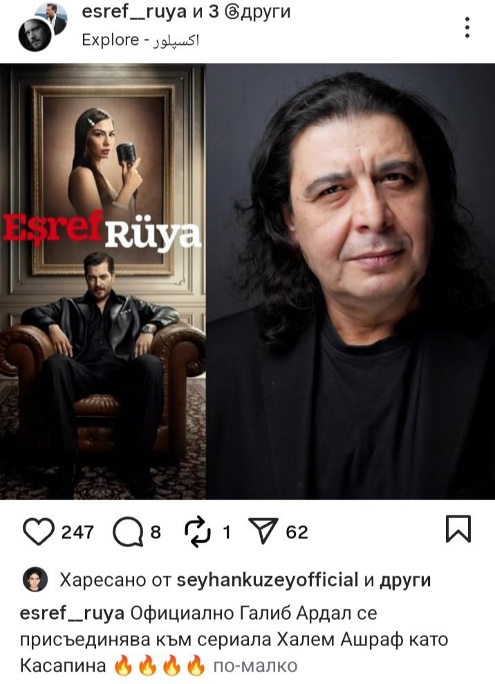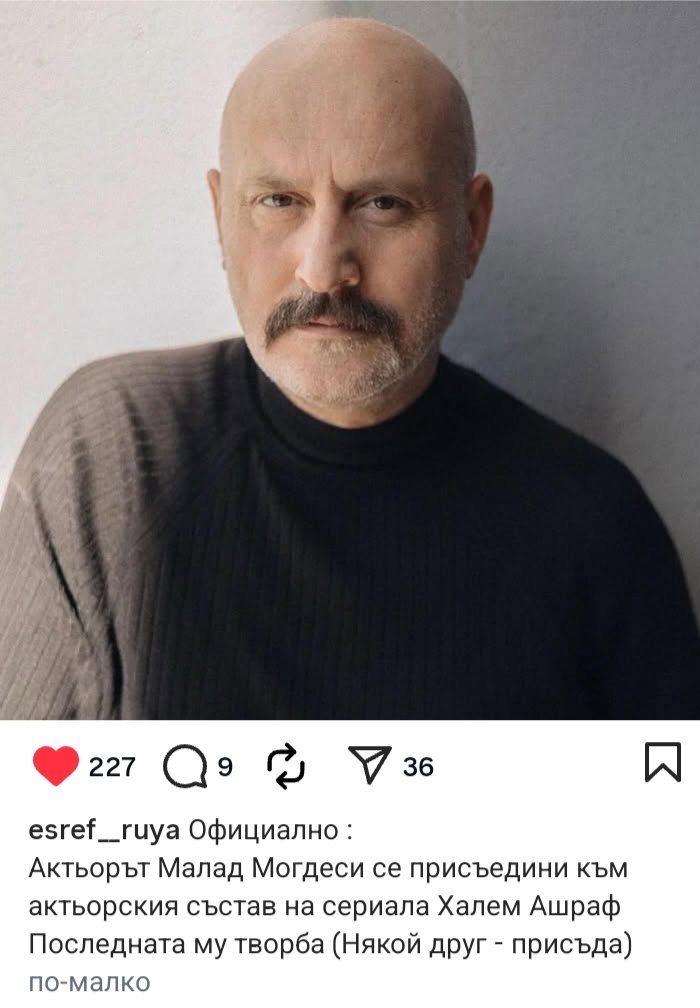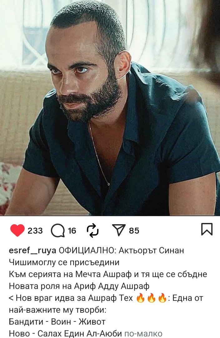 Това което видях преди малко в една фен страница в инстаграм, бързам да ви го споделя. Според тях в сериала влизат нови лица, познайте - всички врагове на Ешреф... 🙄 Аз вече очаквам да му дадат да си поеме въздух, а те май нямат такова намерение. А така ми се искаше да видим силния Ешреф, който наказва предателството и липсата на граници в това кой става жертва на болни амбиции и отмъщение.