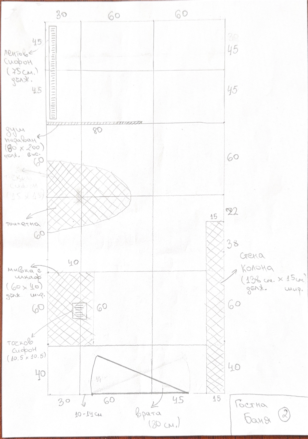 Тъй като държим плочките да са наредени хоризонтално по пода и освен това фугите на пода и стените да съвпадат, в крайна сметка си купихме плочки 60х60 и 120х60, като благодарение на всички ваши съвети от предишните постове, си ги наредихме на лист хартия така, че да спазваме следните неща:
