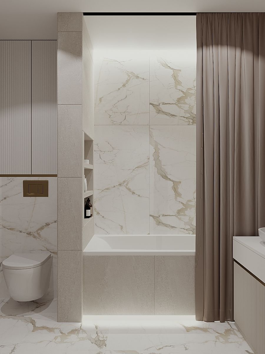 И аз съм сложила завеси, но за съжаление идеята ми корнизът да се вгради в тавана не се осъществи, имаше някаква особеност, която попречи. Завесите са текстилни и си ги пера ежеседмично в пералнята, не се мачкат. Не обичам стъклени паравани, затова избрах класически вариант. Неокласиката търпи и завеси, и стъкло - според предпочитанията на ползвателите.