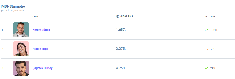 В седмичната класация на IMDb STARmeter, нашите отново заемат челните места: Керем е 1-ви, Ханде е 2-ра Simple Smile