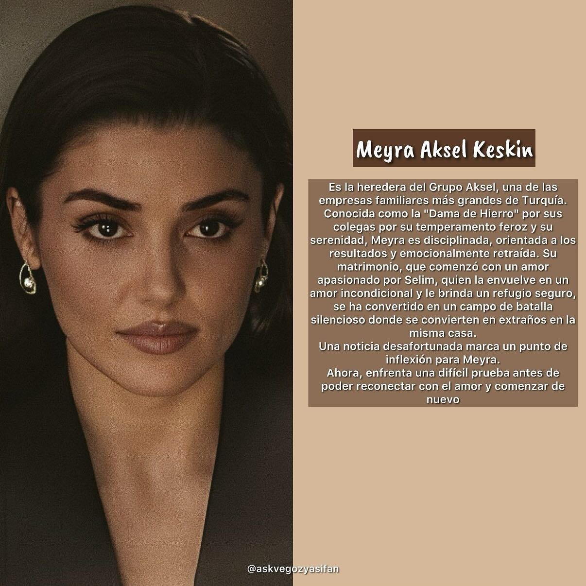 Мейра Аксел Кескин. Мейра е наследница на могъщата Aksel Group, известна със силния си характер и наричана от колегите си „Желязната лейди“. Бракът ѝ със Селим, роден от страстна любов, се е превърнал в продължителна криза, оставяйки двойката без разбирателство. Съдбата е подготвила изпитание, което ще даде на Мейра възможност да преосмисли миналото си и да започне нова глава в живота си.