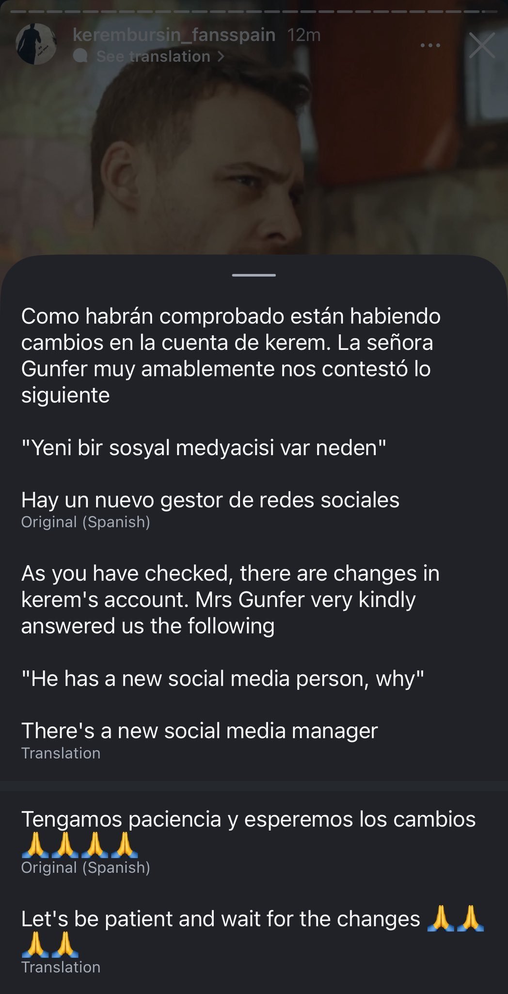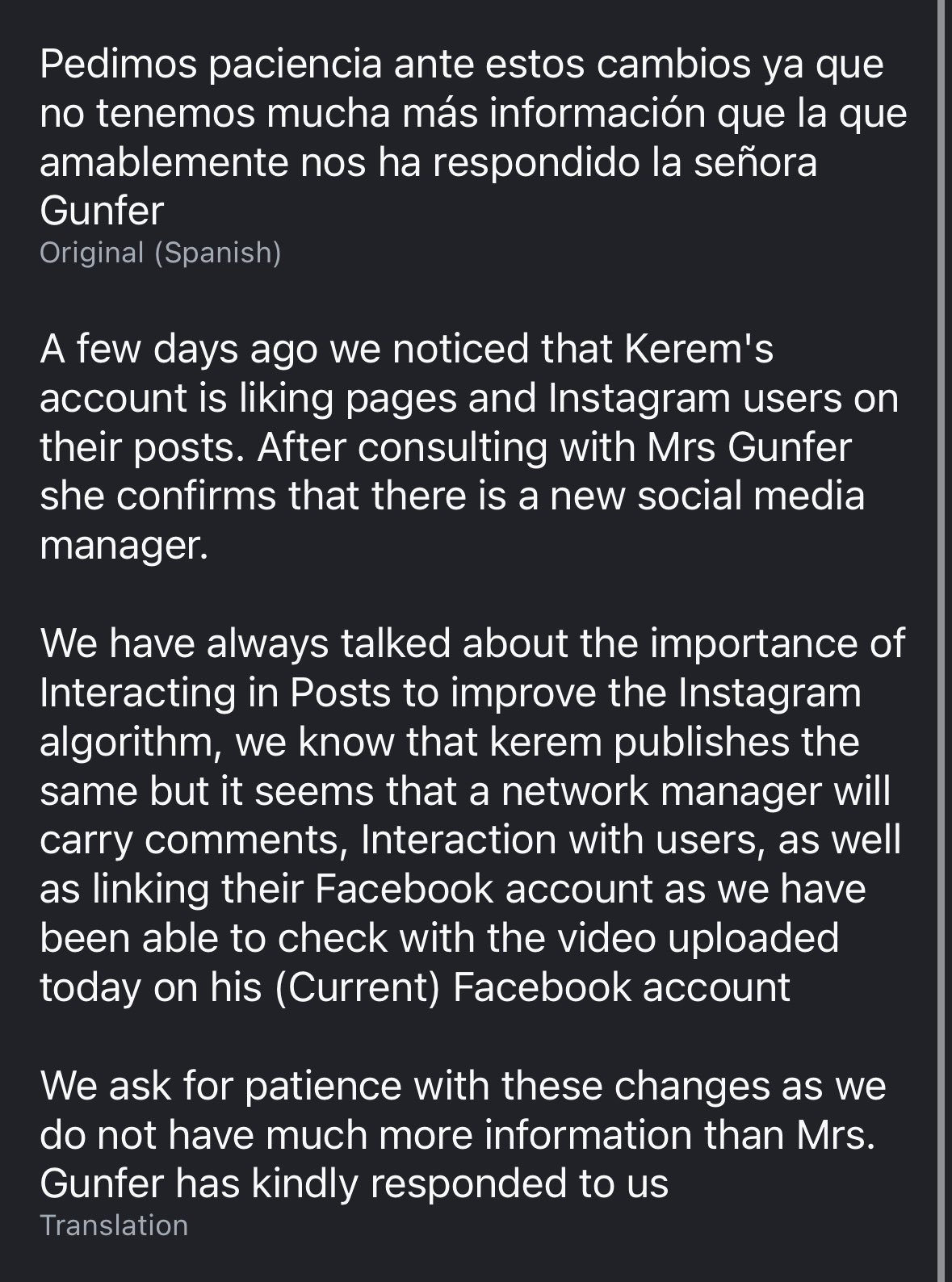 Днес има голямо объркване относно случващото се с Instagram профила на Керем. Един от испанските фен акаунти се свърза с Гюнфер, която любезно ѝ отговори тази вечер. Тя ги информира, че нов мениджър за социални медии в момента работи по акаунта на Керем. Това е добра новина, тъй като от дълго време акаунтът на Керем е обект на постоянен спам. Така че може да има някои промени тук-там в момента, докато не оправят акаунта му. Нека бъдем малко търпеливи.