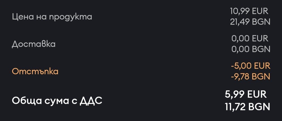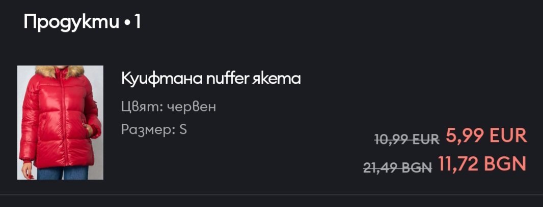 Поръчвам едно намалено яке за втори път, защото не мога да уцеля размера. И двата пъти приложих купон 5 € намаление.