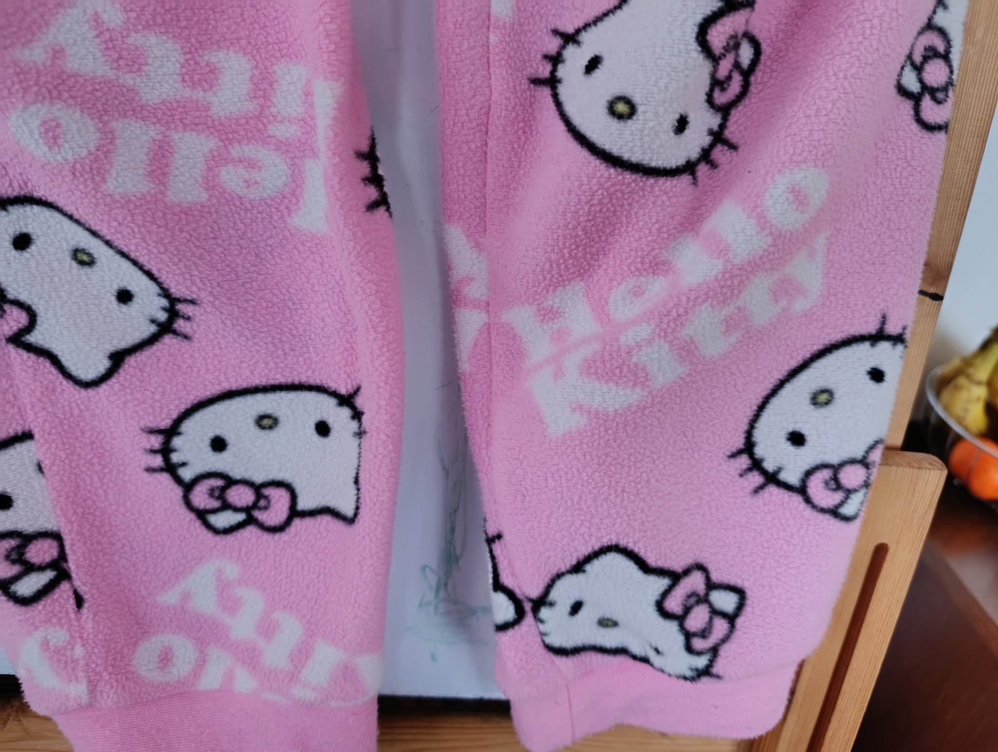 Интересува ме на модела с Hello Kitty как са крачолите долу (телефонът ми звънна и забравих и да погледна, и да снимам- тийнката не харесва да са много стеснени крачолите). Стаята не се отоплява изобщо нощем, а през деня съвсем малко, защото просто не стои по много време там, така че мисля, че ще е ок материята.🤔
