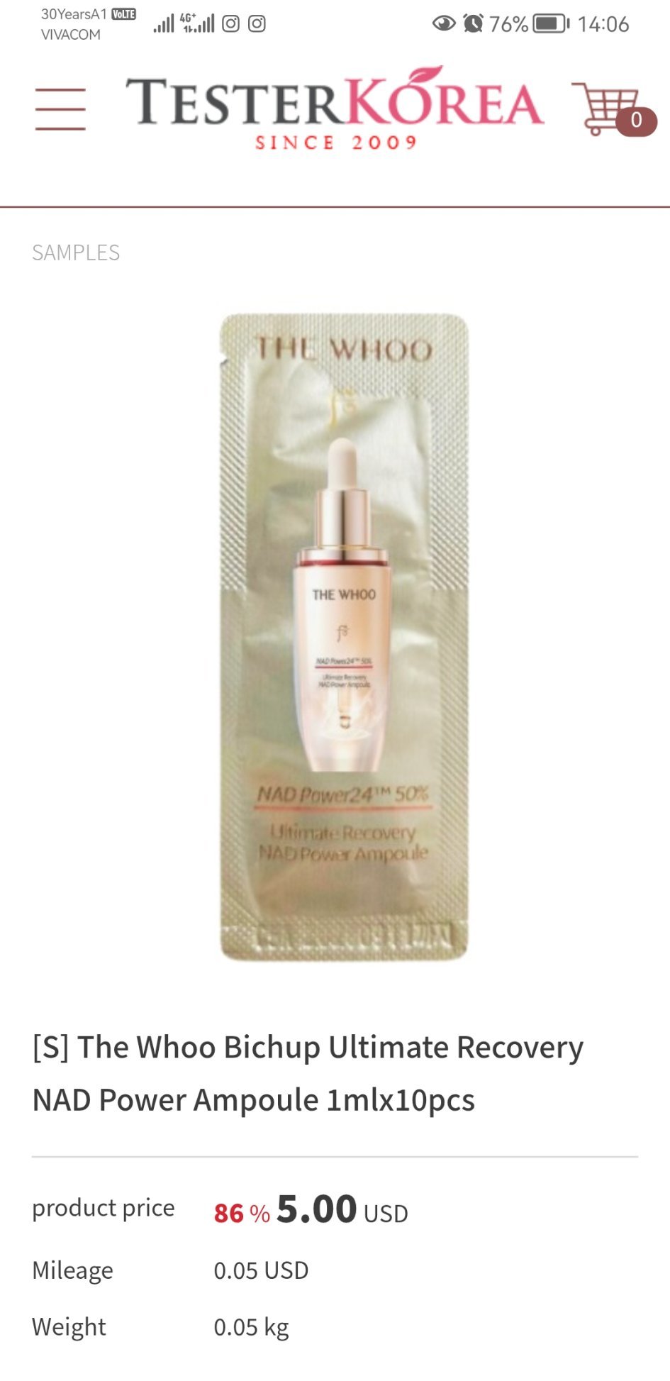 В testerkorea.com са пуснали семпъл на ампулата на The Whoo Bichup, 10мл за 5 usd, но ми позволява само  една десятка да поръчам. Отделно доставката е над 27usd.