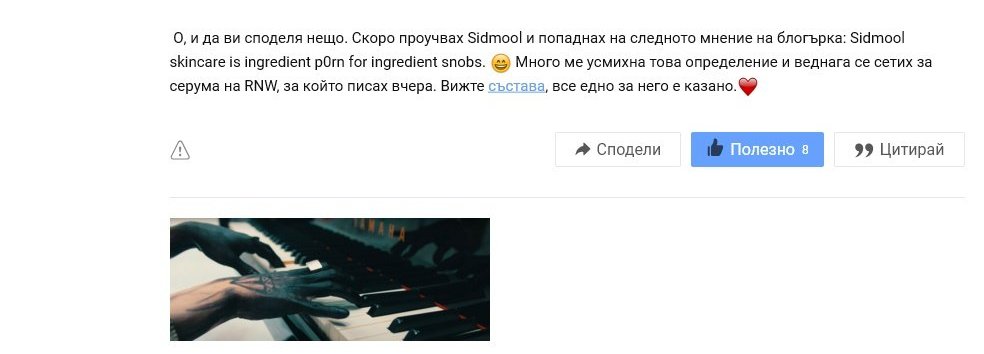 Под това мнение се подписвам с две ръце. Има и други виновни, да не изреждам, ясно е кои са. Пишещите и четящите в темата ги знаем. Но се радвам, че се включих тук и успях да изградя някаква прилична рутина. На моите години и без други намеси, не очаквам чудеса, но мисля, че кожата ми изглежда прилично.