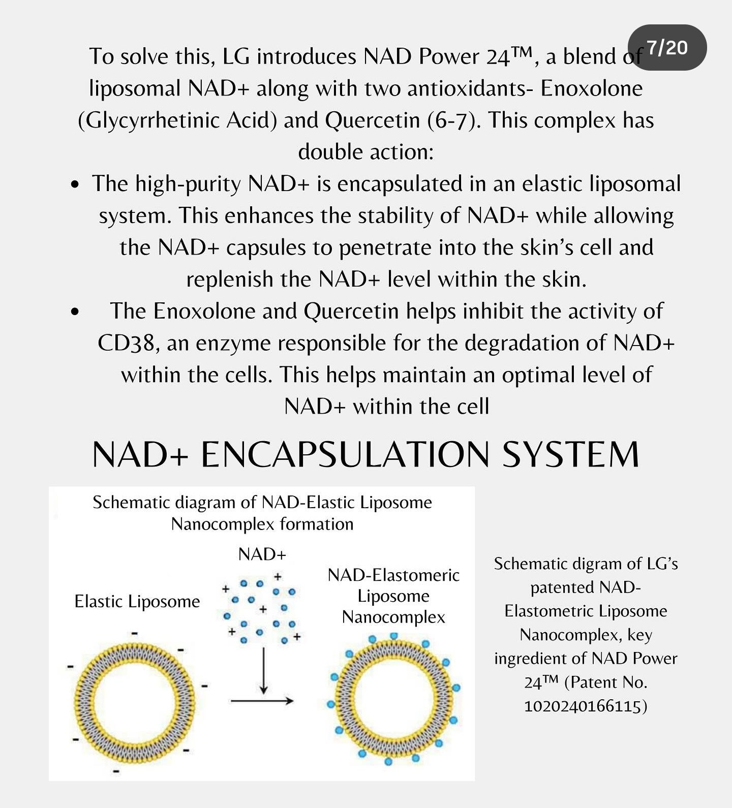 За да се максимизира ефективността на NAD Power 24™ и вътреклетъчния NAD+, формулата съчетава този актив с два класически елемента от традиционната корейска медицина - Licorice (източник на Enoxolone с антиоксидантно и противовъзпалително действие) и Yoonseolran (екстракт от Black Crowberry - Empetrum nigrum L., естествено богат на Quercetin, който стимулира апоптозата на остаряващите клетки и подпомага подмладяването на кожата). Тези две съставки притежават отлични антиоксидантни свойства и са комбинирани в оптимално съотношение, за да предотвратят разграждането на NAD+ в кожата.
