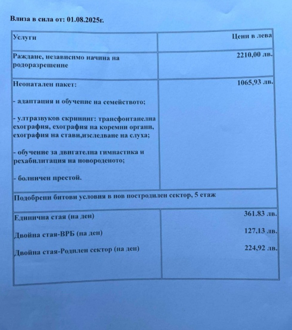 Има вариант за бащата да е с теб, заплаща се мисля нещо от сорта на 80-100 лева на вечер за него и естествено трябва да си в единична стая. Тъй като и аз съм се ориентирала натам, се поинтересувах от възможностите. А за цената много зависи, ако си в двойна стая например, цената не е такава, даже и в единична да си пак е под 5000. Иначе има свиждания от 17:00 до 18:00 мисля бяха, в които може да идва да вижда бебето. Ще кача ценоразписа за тези, които са се ориентирали натам.