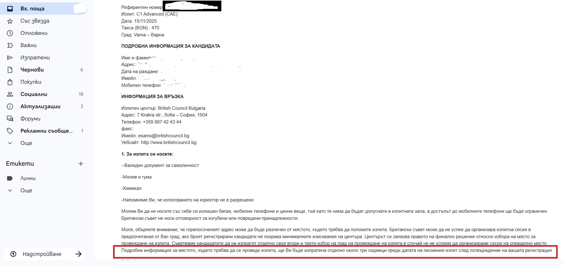 Ако не, +1 да звъннете още утре преди уикенда на British council да разберете повече. На линка има телефон конкретно за изпити, различен от този в скрийншотнатия мейл.