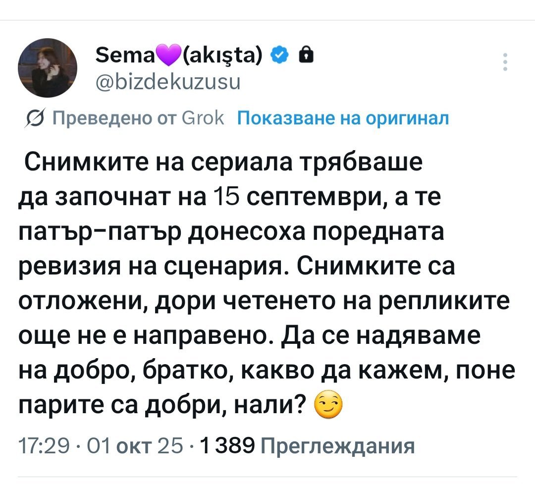 Яд ме хваща. А аз нямам търпение за този сериал на Афра. 😒. Дано скоро има четене на сценария. И Онур иска да изпипа наистина всичко както трябва. Иначе не знам. Но много се радвам за Афра. Пак ще е гост ,като беше в Рияд.