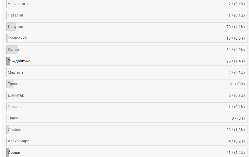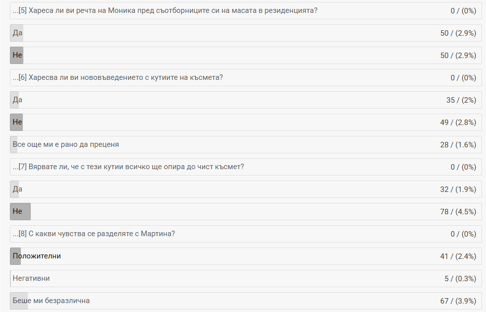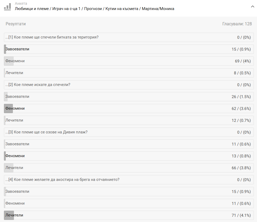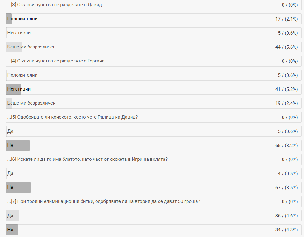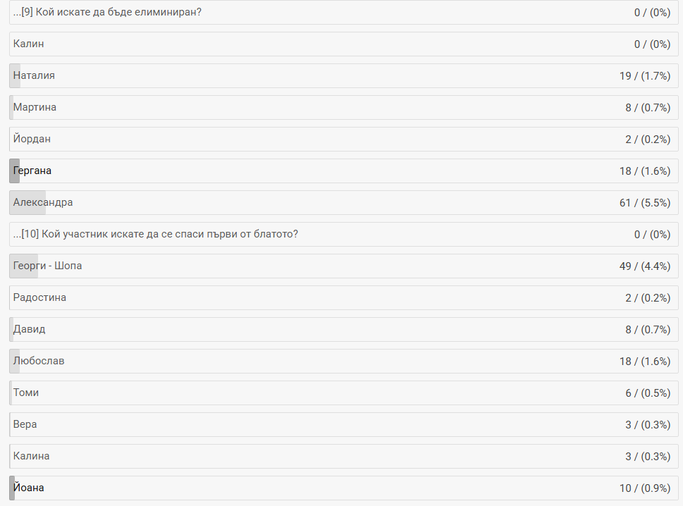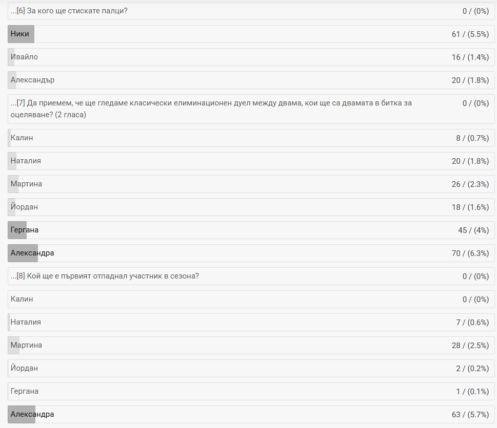 Гласувах за красав(и)ци, с уговорката, че мъжете, които отбелязах (Калин, Траян и Шопа) чак красавци не са ми, но имат определено въздействие. Александър ми е интересен като визия, но с този характер на мишка ме изгуби. От жените Сапунджиева и Йоана.