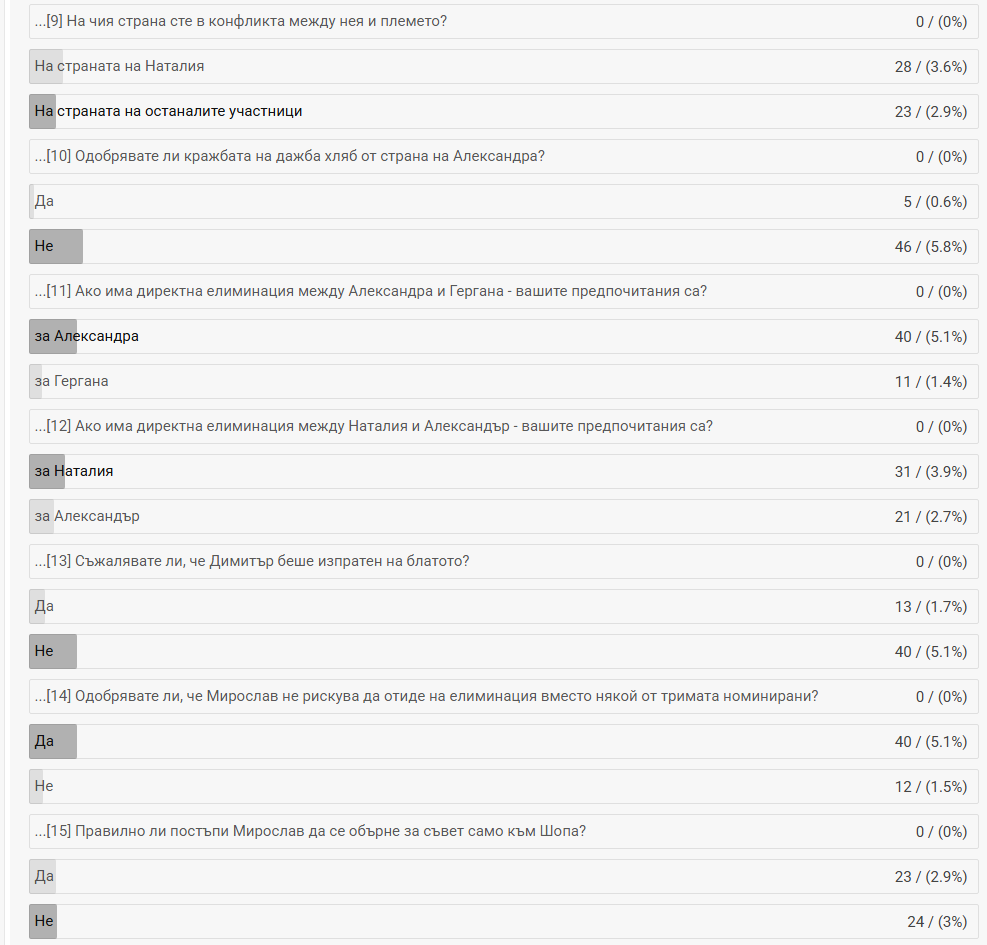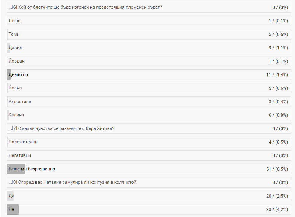 Шопа го насочи към Димитър, защото е слаб в ръцете. Мирослав не искаше да рискува с елиминационна битка, реши да пожали и момичетата и явно бързо се ориентира и ще играе в коалиция с Шопа, Сапунджиева и Теди.
