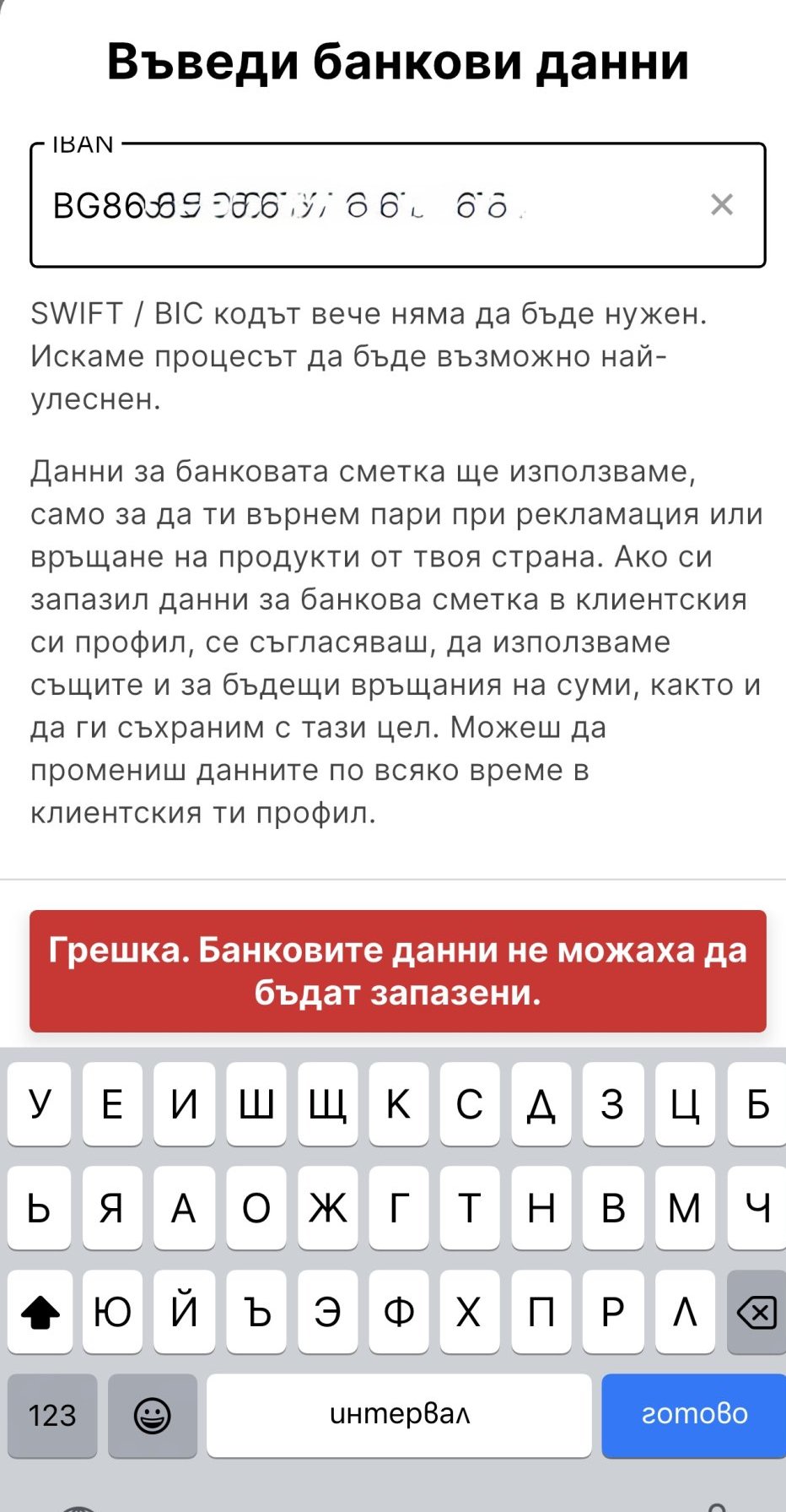 Помощ! Искам да въведа IBAN в банковите си данни в профила, за да върна част от поръчка, но не става нито през компа, нито  през мобилното приложение. Плащането е с наложен платеж. Излиза ми това съобщение: